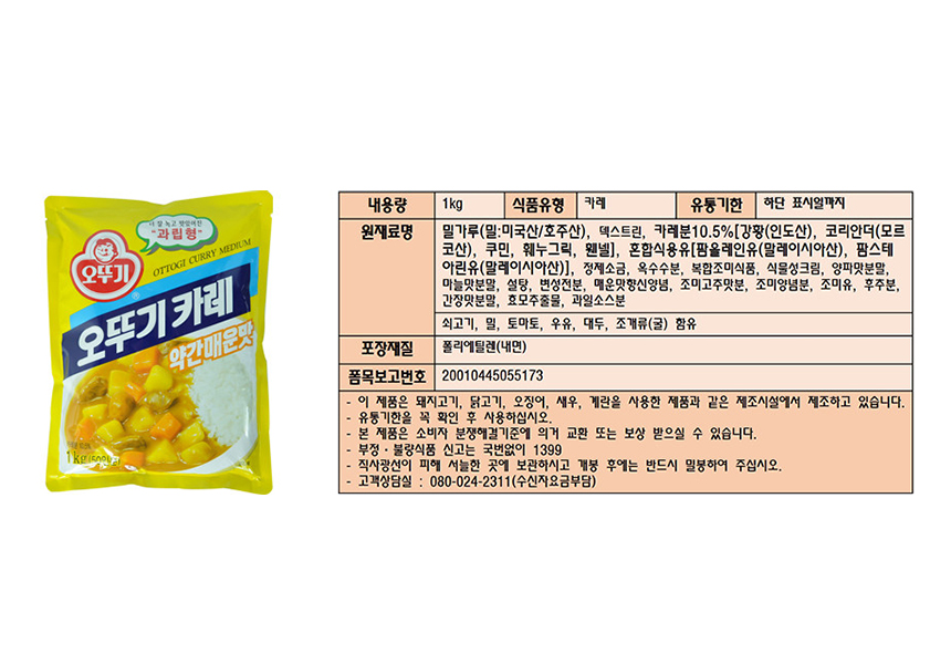 主要成分:小麥粉(小麥:美國,澳洲),糊精,咖哩粉10.5%[土耳其(印度),香菜(摩洛哥),小茴香,茴香,茴香),混合大豆油[棕櫚油(馬拉西亞),棕櫚硬脂(馬來亞)], 鹽,玉米粉,複合調味食品,蔬菜奶油,洋蔥粉,大蒜調味粉,混合配方(改良澱粉,糖,糊精),辣味調味料,糖,紅辣椒粉,加脂蛋白粉,粉狀蛋白 ,水果醬粉,大豆醬粉,酵母提取物[包含牛肉,小麥,番茄,牛奶,大豆,奶油(牡蠣)
