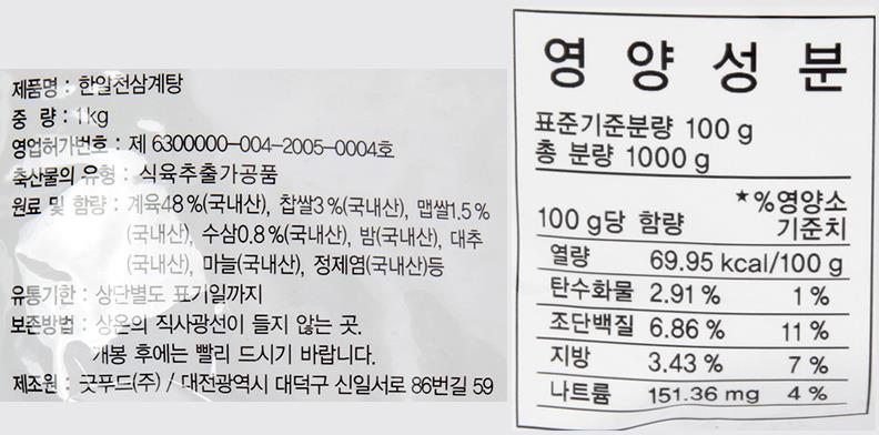 主要成分:雞肉48%,糯米3%,新鮮人參0.8%,栗子,棗,大蒜等