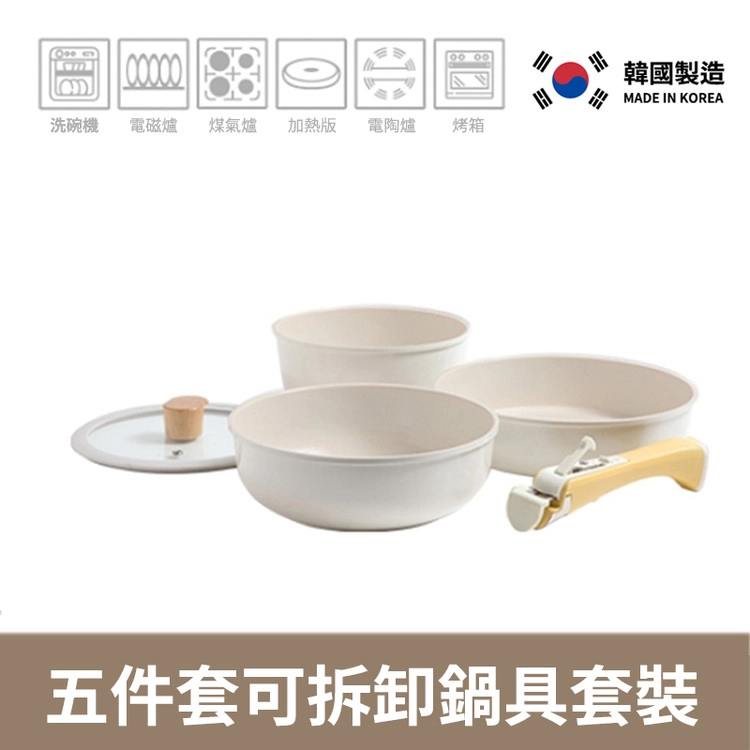 【五件套可拆卸鍋具套裝】不沾底廚具: 20cm湯鍋(帶蓋),22cm 炒鍋, 24cm平底鑊,玻璃蓋,多功能把手