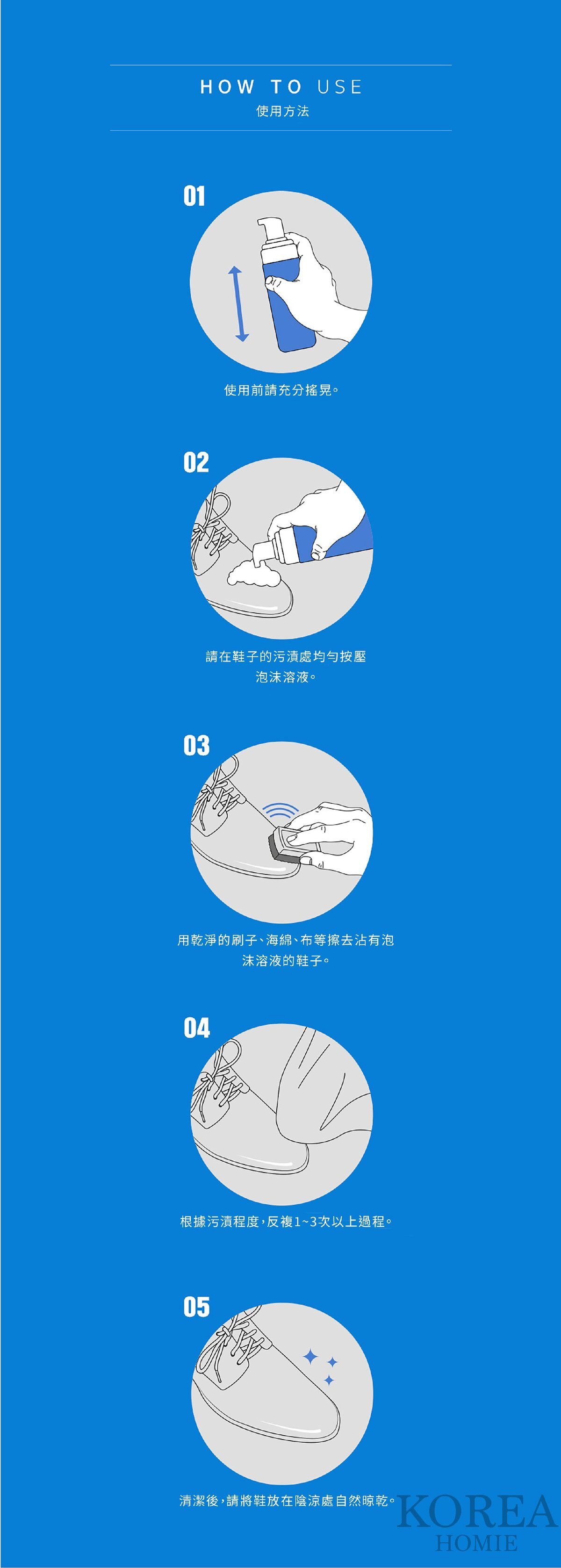 鞋子去污清潔劑是一種泡沫型的鞋清潔劑。免水洗,具有強力去污,深層清潔的功效。 它易於攜帶,可以在家中,辦公室或學校輕鬆使用。
