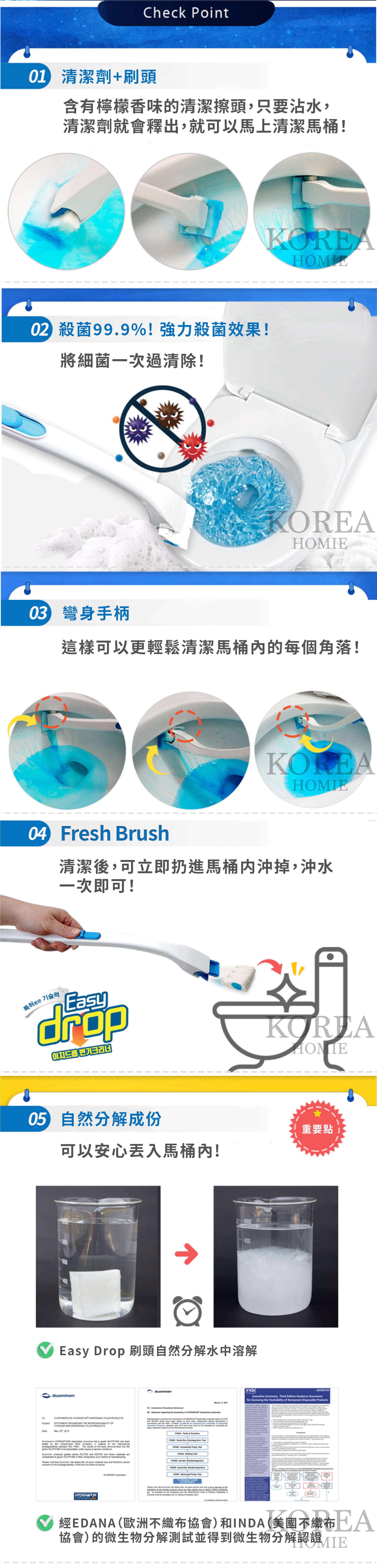 輕鬆清潔馬桶每一角落! 把手靈活有效清潔馬桶暗角位置。 即棄刷頭、清潔後掉進廁所沖走即可 ,不費力、不沾污、輕鬆收藏更衛生~ • 自帶清潔劑衛生方便 • 替換方便,無需手觸 • 產地:韓國 • 氣味: 檸檬味+1個自選味道 自選味道 : 藍色-檸檬味 紫色-薰衣草味 粉紅色 - 白色麝香味 綠色 - 草本植物味 *本店為全港唯一原廠進口商家,信心保證 |